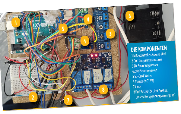 haben. Dank geeigneter Sensoren misst er in beiden Häusern sowie im Außenbereich die Temperatur. Außerdem nimmt er jeweils Spannung und Strom an den Leuchtmitteln auf und übernimmt die