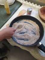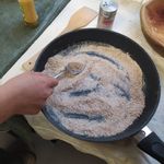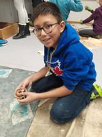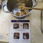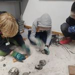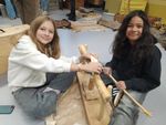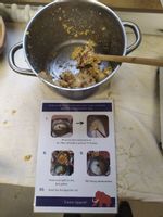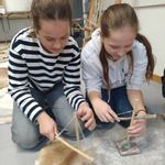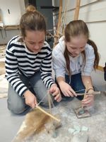 Dann ging es in die Stationen, wo unsere Sechstklässlerinnen und Sechstklässler tätig werden durften. Sie stellten mithilfe steinzeitlicher Bohrer Schmuck her, dazu bearbeiteten sie Speckstein und flochten aus Pflanzenfasern Ketten. Sie töpferten Gefäße zum Trinken und zur Aufbewahrung oder produzierten aus den mitgebrachten Stecken Pfeile und Speere. Einige Kinder mahlten auf einem Mahlstein Weizenkörner zu Mehl, woraus dann ein leckerer Fladen gebacken wurde. Wieder andere kochten Hirsebrei mit Nüssen und Äpfeln, wobei die Äpfel mit eigens hergestellten Faustkeilen erst kleingeschnitten werden mussten. Das gemeinsam zubereitete Mahl rundete diese spannende Reise ab.