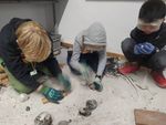 Zu Beginn setzten sich alle Kinder in einem Kreis zusammen, wo sie nach einer Begrüßung durch die beiden Projektleiter damit begannen, die Entwicklung der Menschen in der Steinzeit vom Jäger und Sammler zum Ackerbauern und Viehzüchter durch den Vergleich von originalgetreuen Repliken steinzeitlicher Funde zu analysieren. Schädel und unterschiedlich differenziert ausgebildete Werkzeuge lassen nämlich auf die verschiedenen Menschentypen und ihre spezielle Lebensweise schließen. Eine überdimensionale Zeitleiste, die im Sitzkreis ausgerollt wurde, verdeutlichte die Dimensionen, in denen die Veränderungen der Lebensweise stattfanden.