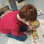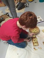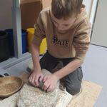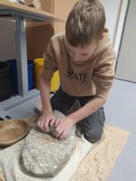 Dann ging es in die Stationen, wo unsere Sechstklässlerinnen und Sechstklässler tätig werden durften. Sie stellten mithilfe steinzeitlicher Bohrer Schmuck her, dazu bearbeiteten sie Speckstein und flochten aus Pflanzenfasern Ketten. Sie töpferten Gefäße zum Trinken und zur Aufbewahrung oder produzierten aus den mitgebrachten Stecken Pfeile und Speere. Einige Kinder mahlten auf einem Mahlstein Weizenkörner zu Mehl, woraus dann ein leckerer Fladen gebacken wurde. Wieder andere kochten Hirsebrei mit Nüssen und Äpfeln, wobei die Äpfel mit eigens hergestellten Faustkeilen erst kleingeschnitten werden mussten. Das gemeinsam zubereitete Mahl rundete diese spannende Reise ab.