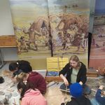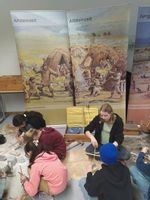 Zu Beginn setzten sich alle Kinder in einem Kreis zusammen, wo sie nach einer Begrüßung durch die beiden Projektleiterinnen damit begannen, die Entwicklung der Menschen in der Steinzeit vom Jäger und Sammler zum Ackerbauern und Viehzüchter durch den Vergleich von originalgetreuen Repliken steinzeitlicher Funde zu analysieren. Schädel und unterschiedlich differenziert ausgebildete Werkzeuge lassen nämlich auf die verschiedenen Menschentypen und ihre spezielle Lebensweise schließen. Eine überdimensionale Zeitleiste, die im Sitzkreis ausgerollt wurde, verdeutlichte die Dimensionen, in denen die Veränderungen der Lebensweise stattfanden.